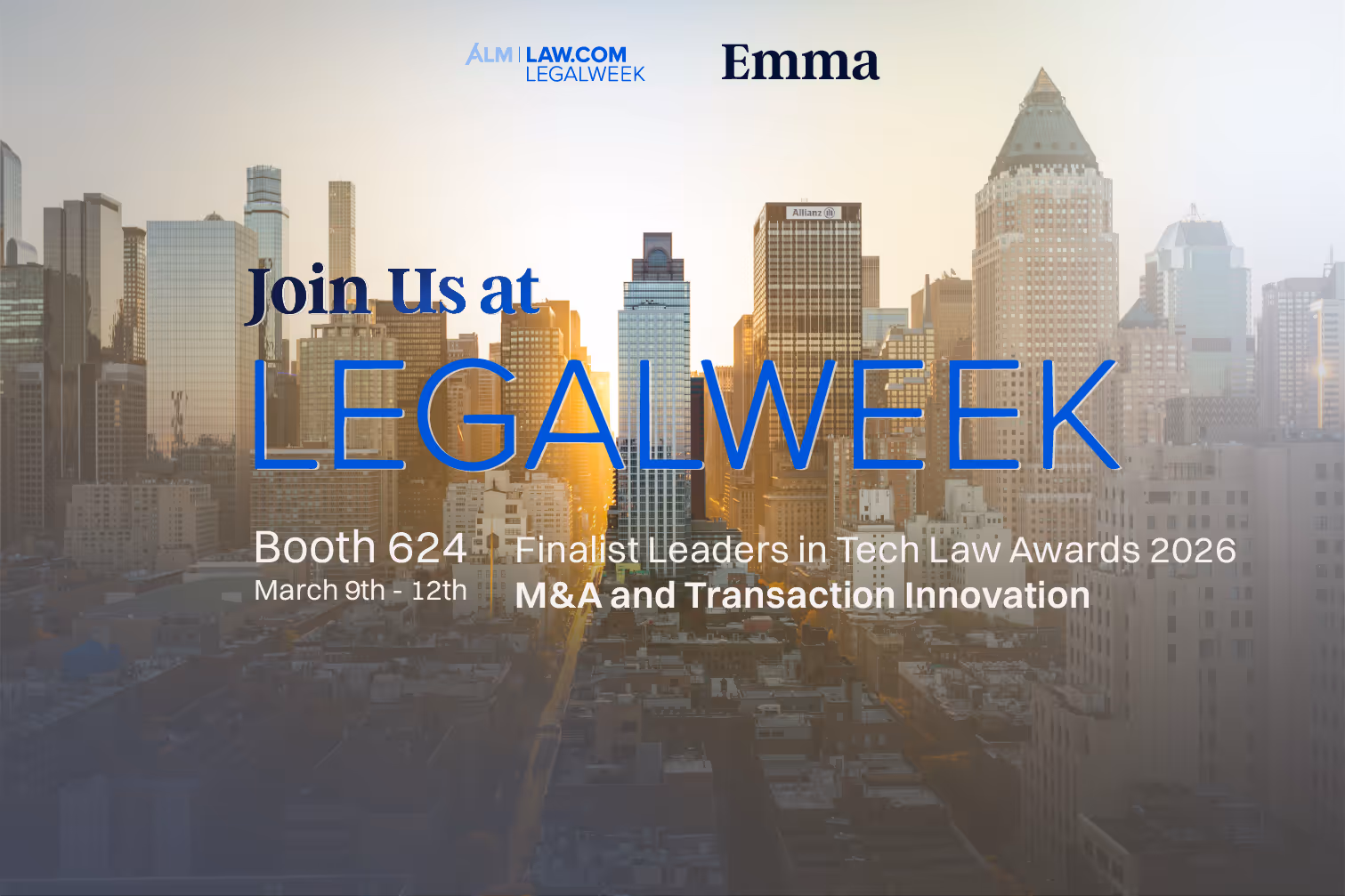 Emma Legal is exhibiting at Legalweek: booth 624. If M&A due diligence is part of your practice, discover how leading law firms are reducing their DD workload with Emma's AI-powered due diligence workspace. Proud finalist: Legalweek Leaders in Tech Law Awards, M&A and Transaction Innovations. Stop by at your own pace, or register ahead so we can expect you.